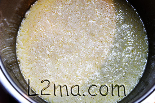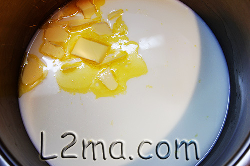 • في قدر كبير يوضع الحليب و الزبدة على النار و يترك حتى يسخن الحليب من دون أن تذوب الزبدة , يبعد القدر عن النار و يترك لبضع دقائق حتى تذوب كل الزبدة و يصبح المزيج دافئاً .